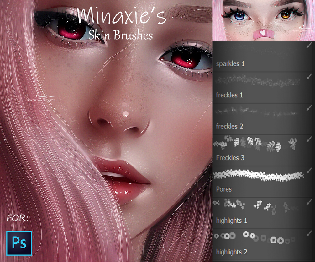 10 skin brushes for PHOTOSHOP only! These include pores, freckles and some details to make your skin in your artworks to look more detailed and outstanding! <3 ( I will make these for procreate in near future as well! sorry for now!)